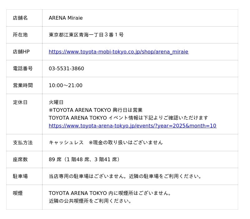 TOYOTA ARENA TOKYO に「ARENA Miraie」をオープン