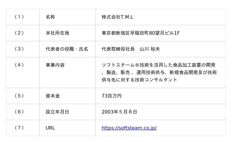 T.M.Lは、湿度100%の飽和水蒸気と熱を用いて食材を加熱処理する「ソフトスチーマー」という最先端下ごしらえ調理器の開発及び販売を行っています。「独自の技術で効率的に均質加熱し、素材の旨味を最大限に引き出す」「1℃単位の加熱温度制御により、旨味・香りなどを最善の状態に引き出す」など、これまで実現困難であった、下ごしらえ調理を実現し、「ソフトスチーマー」及びその加熱調理方法の特許を取得しています。「ソフトスチーマー」はホテル・レストラン・和菓子店・弁当専門店などの、食に関わる様々な業種で導入されています。
