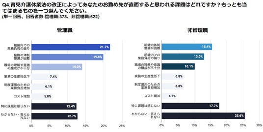 - 非管理職では「特に課題を感じない」「わからない・答えられない」が合計で4割超。この結果から、法改正により管理職は組織全体への影響を課題として認識していることが明らかになった。一方、非管理職の多くは具体的な課題を認識していない状況がうかがえる。管理職にとっては、引継ぎや代替要員の確保、業務負荷の偏りといった欠員への対応が大きな課題となる。従業員の負担を増やさずに、どのように制度を運用していくかが今後の焦点となりそうだ。