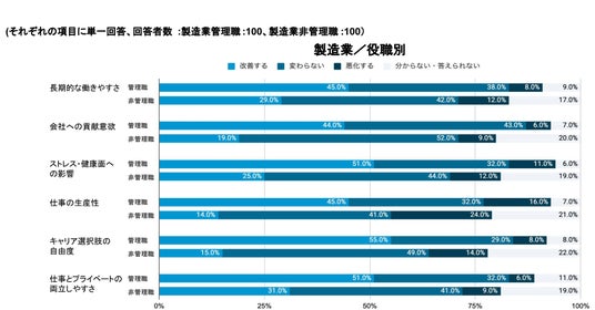 - 製造業の非管理職では「仕事の生産性」に関して「改善する」よりも「悪化する」と回答した割合の方が高かった。