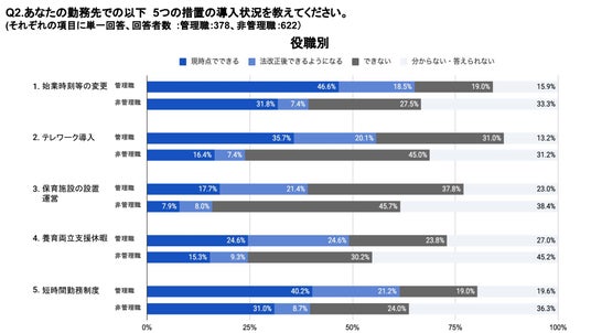 - 全体では「テレワーク導入」「養育両立支援休暇の付与」「始業時刻の変更」が上位。