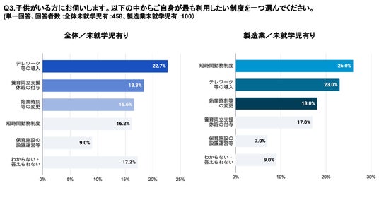 - 製造業の子どもがいる従業員は、「短時間勤務制度」「テレワークの導入」「始業時間の変更」の順で支持。製造業では現場作業が多い背景から、「短時間勤務」を求める声が強いと考えられる。