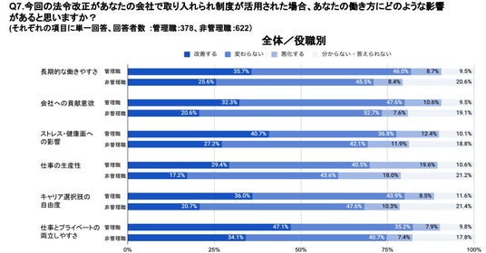 解決策として、「業務の標準化・マニュアル化」が管理職の間で最も支持され、ハード面では「業務システムの導入」が重要視された。法改正の影響については、全体的にポジティブな評価が多く、「企業イメージの向上」が期待されている。しかし、製造業の非管理職は「生産性の低下」を懸念する傾向がみられ、柔軟な働き方を促進しながら生産性を高めることの難しさが課題として浮かび上がった。
