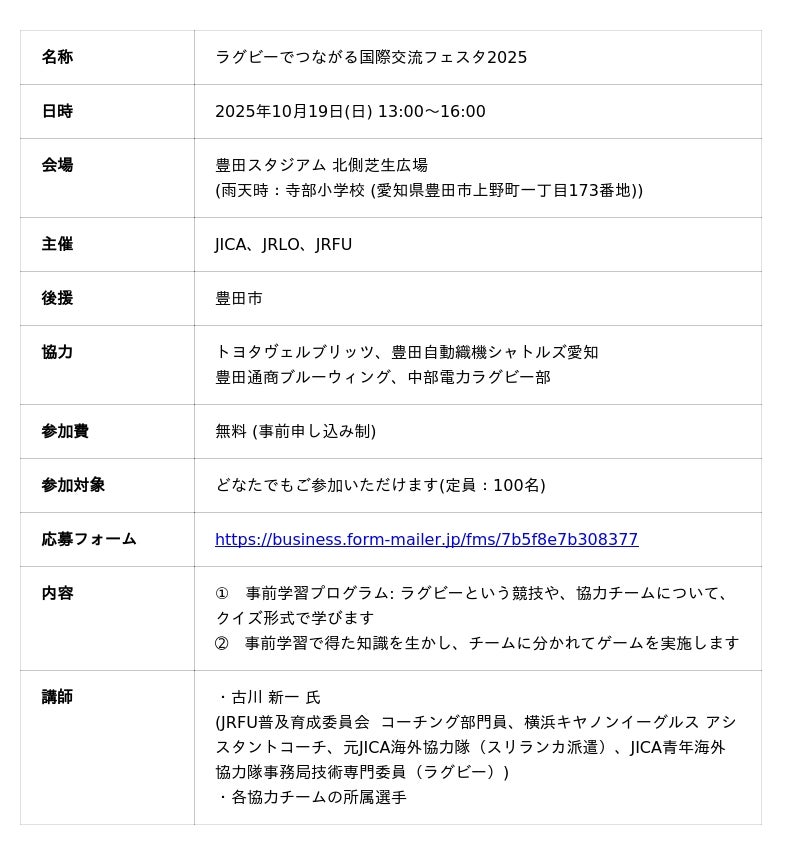 公益財団法人日本ラグビーフットボール協会(以下「JRFU」、会長:土田 雅人、東京都港区)と一般社団法人ジャパンラグビーリーグワン(以下「JRLO」、理事長:玉塚元一、東京都港区)、独立行政法人国際協力機構(以下「JICA」、理事長:田中 明彦、東京都千代田区)は、2025年6月17日に締結した三者連携協定に基づき、豊田市後援のもと、10月19日(日)に「ラグビーでつながる国際交流フェスタ2025」を開催いたしますので、以下の通りお知らせします。