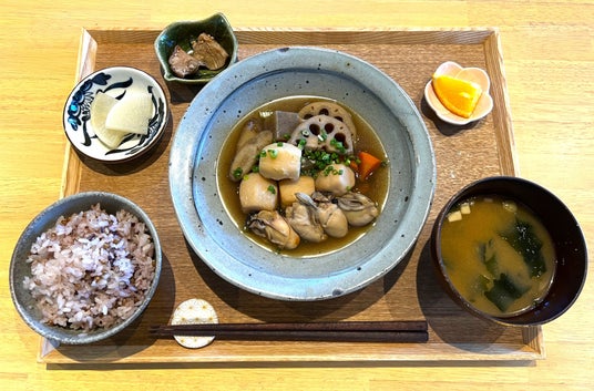 牡蠣とおかやまの根菜・里芋の炊き合わせ牡蠣の旨味を凝縮した煮物に、岡山県特産の里芋をあわせた温かい一皿。ごはんは、白米・雑穀米・地魚混ぜごはんの3種類からお選びいただけます。