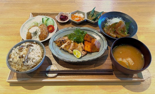 PUUT 秋の彩り御膳松茸の香り豊かな松茸ごはんと、やわらかな若鶏の塩焼きに、甘みのあるかぼちゃを添えた一品。地元食材を使ったおばんざいを取り入れ、秋を贅沢に味わえる御膳です。