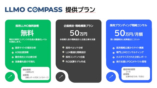 LLMO COMPASSのリリースを記念し、先着3社限定で、LLMOプランをご契約いただいた企業様へ「採用サイト無料制作」をプレゼントするキャンペーンを実施いたします。この機会に、AIに最適化された採用ブランディングと、魅力的な採用サイトを同時に手に入れ、貴社の採用活動を加速させてください。