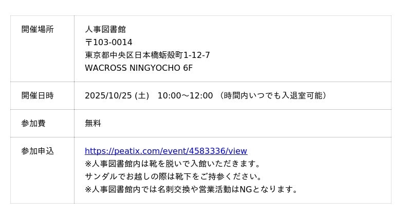 【10月25日(土)参加無料】「ちょっと気になる…」を解消!人事図書館が10月に見学会を開催@東京 人形町