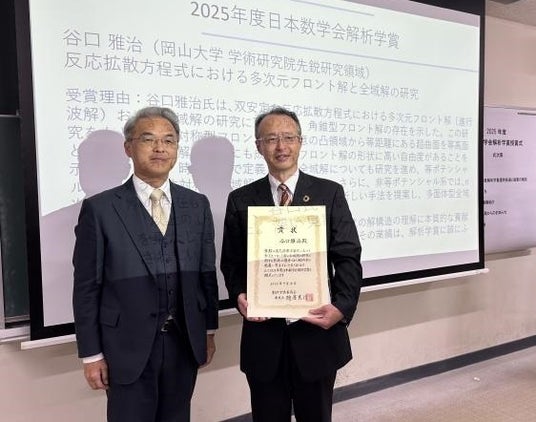 受賞にあたり谷口教授は、「反応拡散方程式においてフロント型進行波と全域解の研究を行い、近年、この二つの解の関係を解明しました。その成果が 日本数学会解析学賞として認められ、身の引き締まる思いです。今後も解析学の発展に努力いたします」と喜びを語りました。引き続き、地域中核・特色ある研究大学:岡山大学の取り組みにご期待ください。