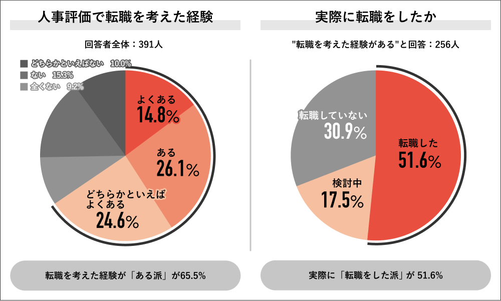 回答者全体の391人に人事評価で転職を考えた経験を聞くと、「ある派」が65.5%と過半数を占め、内訳は「よくある」が14.8%、「ある」が26.1%、「どちらかといえばある」が24.6%となりました。転職を考えた経験があると回答した256人に実際に転職をしたかを聞くと、「転職した派」が51.6%で過半数を占め、「検討中」が17.6%、「転職していない」が30.9%となりました。