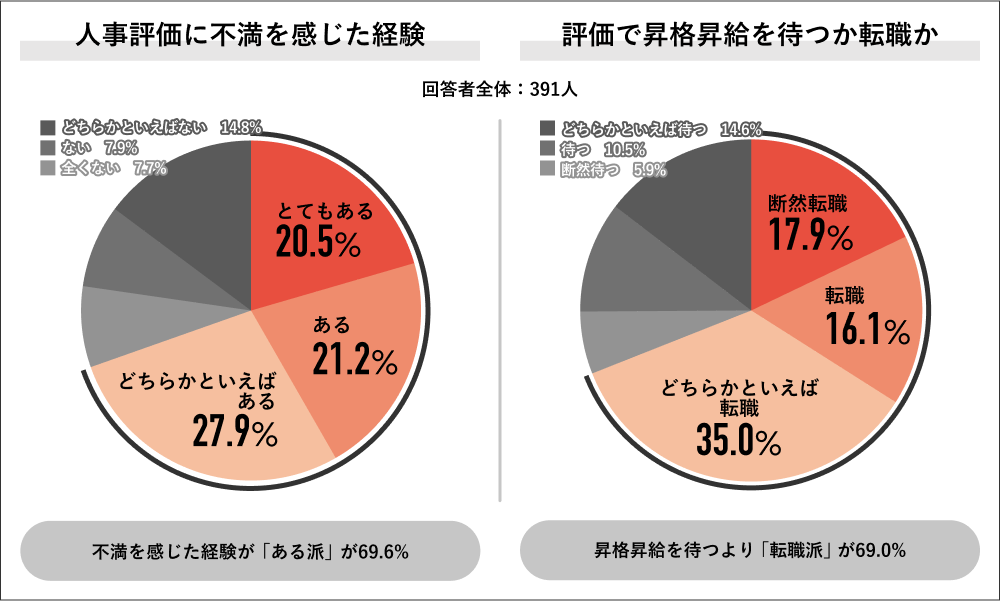 回答者全体の391人に、人事評価に不満を感じた経験を聞くと、「ある派」が69.6%と過半数を占め、内訳は「とてもある」が20.5%、「ある」が21.2%、「どちらかといえばある」が27.9%となりました。また、人事評価での昇格昇給を待つか転職かどちらを選ぶか聞くと、「転職派」が69.0%と過半数を占め、内訳は「断然転職」が17.9%、「転職」が16.1%、「どちらかといえば転職」が35.0%となりました。