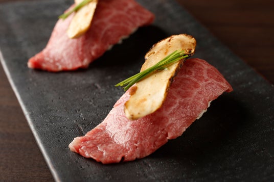 和牛の濃厚な旨味と、松茸の芳醇な香りが一口で堪能できる、季節限定の握り寿司です。