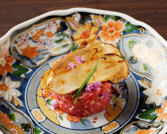 鹿児島黒牛を使用した特製ユッケに、香ばしく炙った松茸を贅沢に添えました。季節ならではの組み合わせをお楽しみください。
