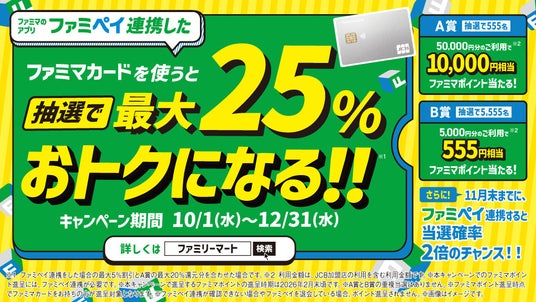 2025年10月1日(水)~12月31日(水)までの期間中、「ファミマカード」をご利用いただく皆さまを対象に、ファミペイ連携のうえで、ファミリーマートを含む、JCB加盟店にて利用すると、抽選で最大25%おトクになるキャンペーンを実施いたします。
