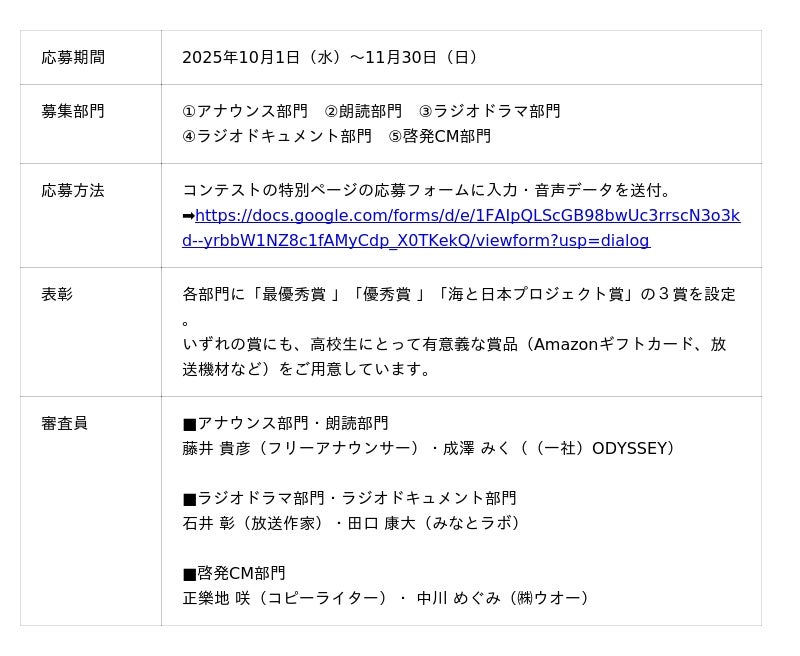 一般社団法人うみ文化研究機構は、「届け!海の声~高校生ラジオコンテスト~」を実施し、2025年10月より全国の高校生から5つの部門で音声作品を募集します。