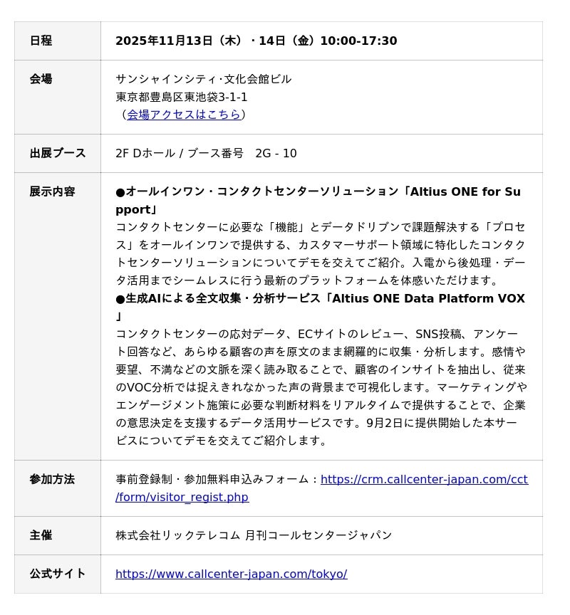 アルティウスリンク、11月13日・14日開催「コールセンター/CRMデモ&コンファレンス2025 in東京」に出展