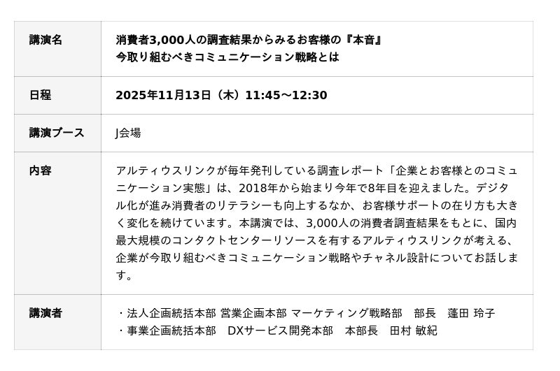 アルティウスリンク株式会社(所在地:東京都渋谷区、代表取締役社長:若槻 肇、以下 アルティウスリンク)は、2025年11月13日(木)・14日(金)に開催される「コールセンター/CRMデモ&コンファレンス2025 in東京」に出展します。