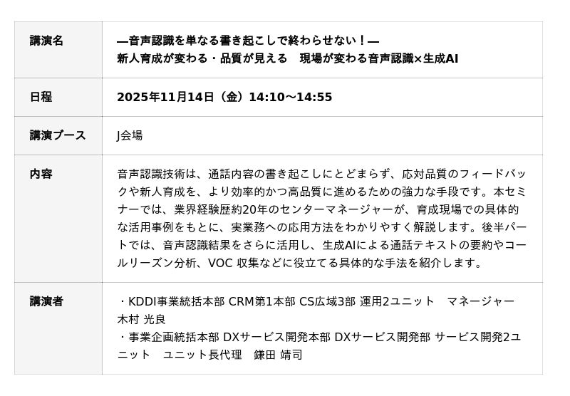 当社の出展ブースでは、生成AIを搭載した最新のクラウド型コンタクトセンター基盤や、お客様の声をリアルタイムで可視化・分析するデータ活用サービスなど、業務革新を支える多彩なソリューションをデモンストレーション形式でご紹介します。また、音声認識ツール活用や、コミュニケーション戦略・チャネル設計をテーマにセミナーを開催します。コンタクトセンター運営に関する課題をお持ちの方は、ぜひお気軽にお立ち寄りください。