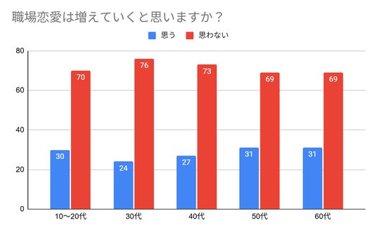「今後、職場恋愛は増えていくと思いますか?」の設問では、いずれも世代も「思わない」と回答した方が多く、約7割という結果でした。