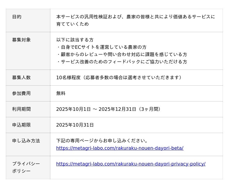 そこで、農業×新技術を推進するコミュニティ「Metagri研究所(運営会社:株式会社農情人)」は、農家専用AIアシスタント「らくらく農園だより」の実証実験を開始します。本サービスは、スマホでレビューをスクリーンショットするだけで、10秒で心のこもった返信文を自動生成します。農作業の合間に、アプリ不要でご利用いただけます。本日より3ヶ月間無料でご利用いただくテストユーザーを【10名様限定】で募集します。