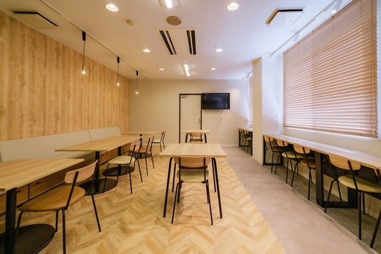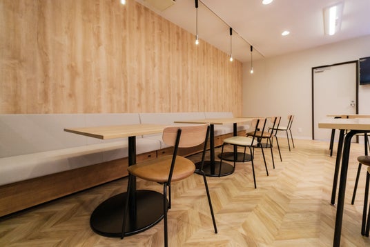 ・休憩やランチタイムに利用できる、木目調でくつろげるカフェスペースを設備。照明を執務