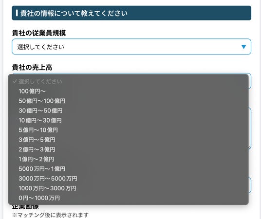 売上金額欄をはじめとする選択肢を増やし、企業規模や強みをより正確に表現可能に。仲介会社が提案時に参照しやすい情報基盤を整えました。