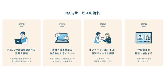 買収希望条件を匿名で投稿することで、複数のM&A仲介会社から直接オファーを受けられる新しいマッチングプラットフォームサービス1.買い手企業は完全無料で利用可能