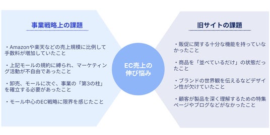 Amazonや楽天など大手プラットフォームへの依存は、手数料の増大や規約変更のリスクなど、多くの中堅企業が直面する経営課題です。テクタイト株式会社様も手数料の問題から自社ECサイトの確立が急務でしたが、旧サイトは機能やコンテンツ不足から売上が伸び悩んでいました。