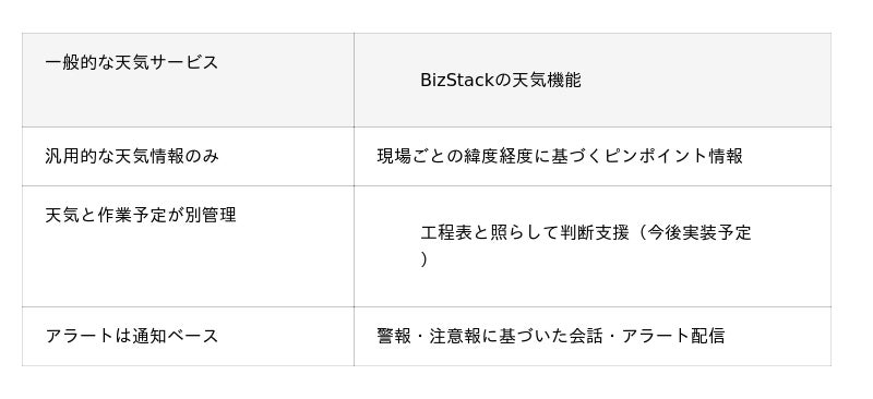 BizStackの天気機能は、一般的な天気アプリやテレビの天気情報とは異なり、現場業務に特化した設計となっています。