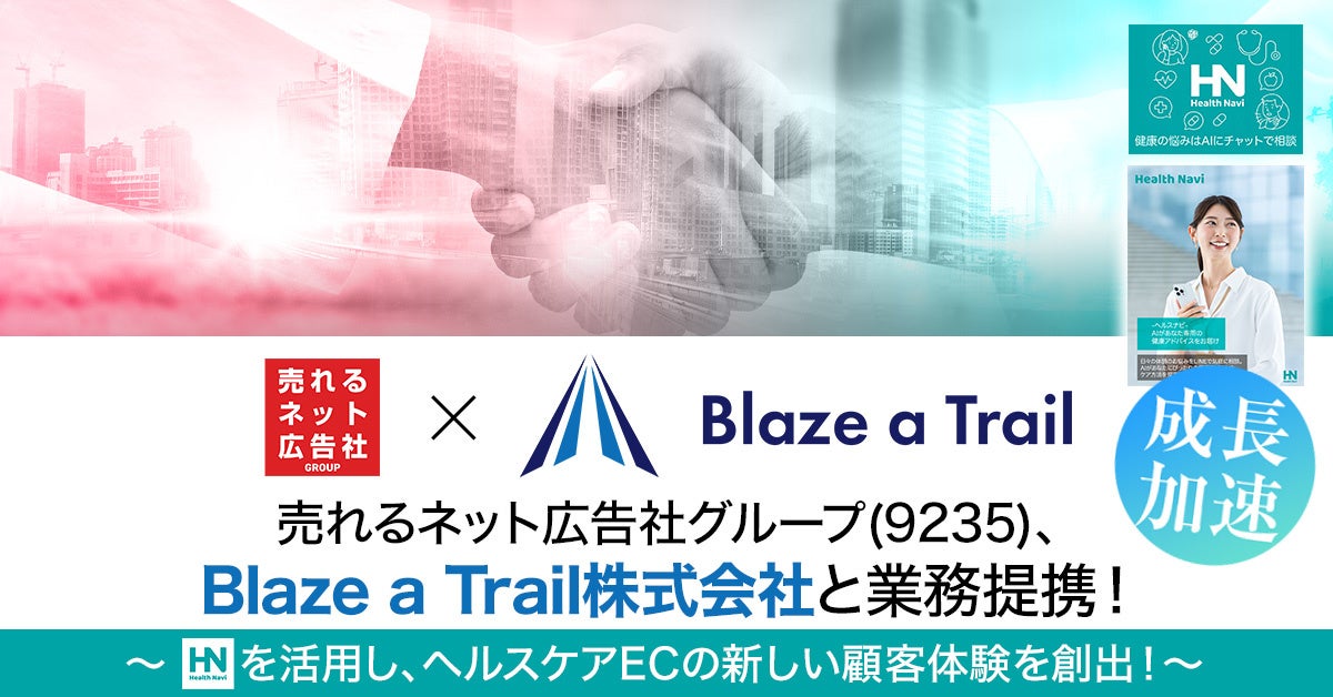 【成長加速】売れるネット広告社グループ(9235)、Blaze a Trail株式会社と業務提携!~ 「ヘルスナビ」を活用し、ヘルスケアECの新しい顧客体験を創出 ~