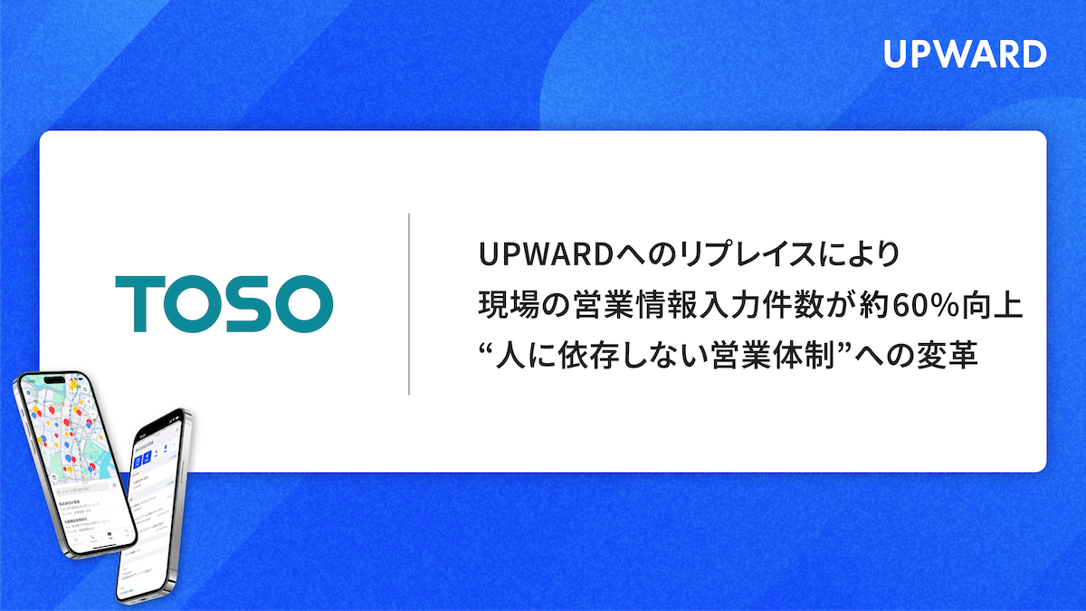 UPWARD株式会社(所在地:東京都千代田区、代表取締役 CEO:金木 竜介、以下 UPWARD)は、トーソー株式会社(本社:東京都中央区、代表取締役社長 :八重島 真人、以下 トーソー)が営業支援サービス「UPWARD」を導入したことをお知らせいたします。