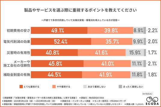 株式会社ECODA(本社:東京都渋谷区、https://ecoda-corp.com/)は、戸建てで多世代同居していて太陽光発電・蓄電池を1.導入している/2.導入していない方を対象に、「太陽光発電・蓄電池ユーザーの導入判断と選定理由」に関する調査を行いました。