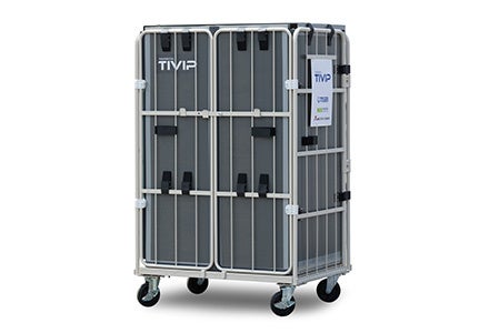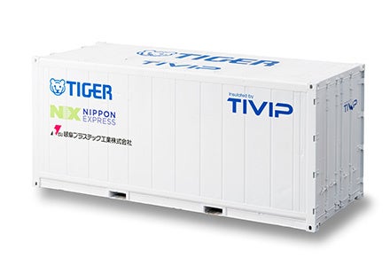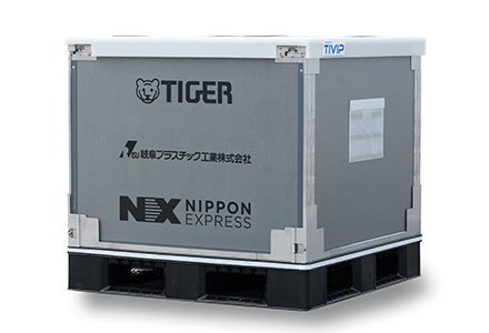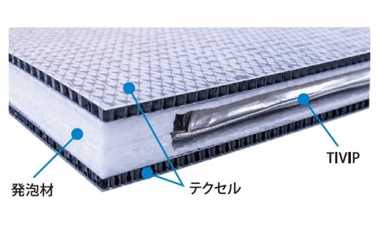 大阪・関西万博内での活用においては、当社が新開発したステンレス密封真空断熱パネル「TIVIP」を岐阜プラスチック工業の軽量・高強度素材である樹脂製ハニカムパネル「テクセル」でサンドイッチすることで、TIVIPを保護し軽量かつ強固な断熱ユニットパネルとなっております。この断熱ユニットパネルを日本通運の輸送梱包ツールである「プロテクトBOXサーマル」などに採用することで、高性能な保冷輸送が可能となりました。従来の冷凍・冷蔵・定温輸送では、温度維持のために蓄冷材や蓄熱材の使用が必須でしたが、資材を不要とし、電力使用量の大幅な削減を実現します。