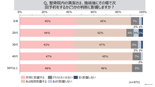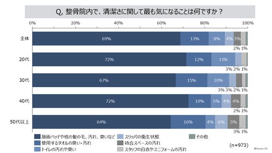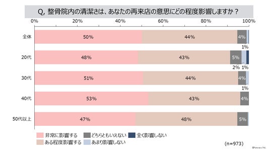 お客さまの声を最先端の分析でファン増加につなげる企業、株式会社ファンくる(本社:東京都千代田区、代表取締役社長:山口敬人)は、「ファンくる」会員を対象に、定期的に消費者の意識調査を実施しています。今回は整骨院の清潔さについて、再来店意思への影響や、清潔さが最も気になる箇所などを「ファンくる」会員973名(男性197名、女性776名)に調査を実施しました。
