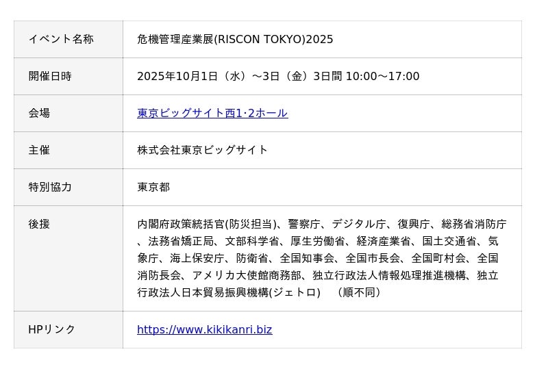 株式会社ノビタス(本社:神奈川県横浜市、代表取締役社長:羽田野正治、以下 当社)は、2025年10月1日から3日まで東京ビッグサイトで行われる「危機管理産業展(RISCON TOKYO)2025」に出展します。
