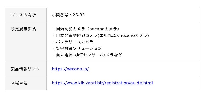 展示会では、ネットワークカメラを用いたお客様の課題解決を実現するソリューションを紹介。セキュリティや災害対策といった社会の安全や安心を守るソリューションとして、「街頭防犯カメラ」や「自立発電型防犯カメラ」などのnecano※カメラを中心に、展示いたします。
