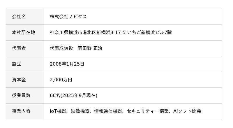 ノビタスは、ネットワークカメラやモバイルネットワーク、AIソフトや画像処理などの情報通信機器をお客様の課題に合わせて最適なIoTソリューションとして提案・提供しています。創業以来「現場主義」をモットーに、官民問わず様々な業種のお客様からの厳しい要望に応えてきました。当社は今後もIoT技術と人の持つ力を結集し、お客様一人ひとりの課題解決を目指す" オプティマゼーション(お客様の「声」の最適化)・カンパニー"として、社会全体の安心と安全を守り、より良い未来を創造するために、日々進化を続けていきます。