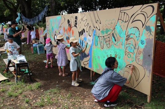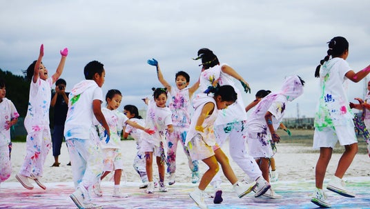 子どもたちが自分らしさを表現できるアートパフォーマンスです。えのぐを地面いっぱいに広げ、音楽に合わせて、手で、足で、全身で椿森コムナを彩りましょう。
