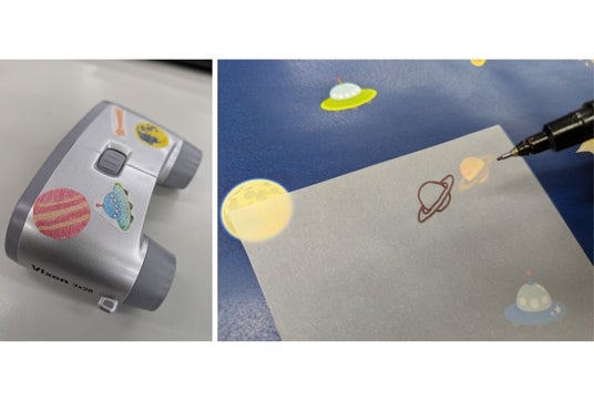 双眼鏡デコレーショントレーシングペーパーに、好きな絵や模様を描いてシールを作成。できあがったオリジナルシールを使って、双眼鏡を自由に飾り付け、自分だけの特別なデザインに仕上げていきます。