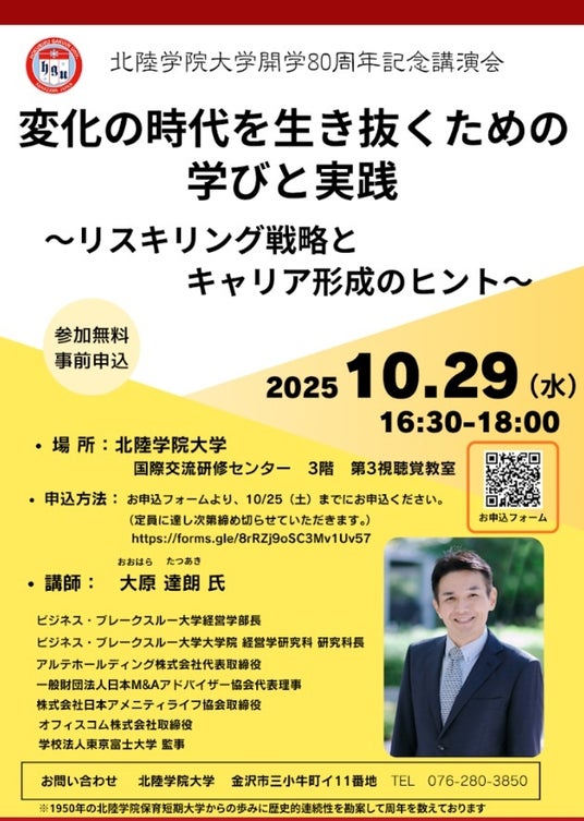 このたび、ビジネス・ブレークスルー大学 経営学部長の大原達朗が、提携先である学校法人北陸学院(所在地:石川県金沢市/理事長:堀岡 満喜子、以下「北陸学院」)の80周年記念講演に登壇することをお知らせいたします。