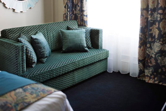 客室に入ると目に飛び込む、大きな花や植物が表現されたカーテンと壁紙が主役の客室。アートのような大胆な柄の配置は、まるでヨーロッパのブティックホテルのよう。この客室はカラースキームのリケン/ジェイドからJADEと名付けられました。ジェイドとは翡翠の意。青みがかった緑でエキゾチックに部屋全体をまとめあげました。差し色にはリケン、ベッド上のクッションや、ベッドスローの柄に、黄味がさりげなくコーディネートされています。ベッドスローのおもてには柄を合わせた技ありのつなぎ目、裏は生地の向きを工夫して、つなぎ目なしで縫製されているこだわりです。帯やアンティーク着物からインスパイアされたパターンのクッションが総張りのソファに置かれ、ここにもさりげなく日本を意識したアイテムがスタイリッシュに配されています。壁紙とカーテンから色合わせをした青みを混ぜた黒の絨毯も、上品で気品ある雰囲気を演出しています。(*絨毯はLIBERTYではありません)
