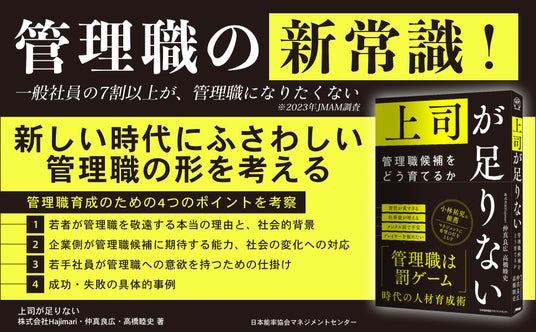 株式会社Hajimari(所在地:東京都渋谷区、代表取締役:木村 直人、以下 当社)は、執行役員・仲真 良広、メンタープロパートナーズ事業責任者・高橋 睦史の共著となる書籍『上司が足りない 管理職候補をどう育てるか』が、株式会社日本能率協会マネジメントセンター(代表取締役社長:張 士洛、東京都中央区、以下JMAM〔ジェイマム〕)より2025 年9 月30 日(火)から全国の書店、ネット書店にて発売となることをお知らせいたします。