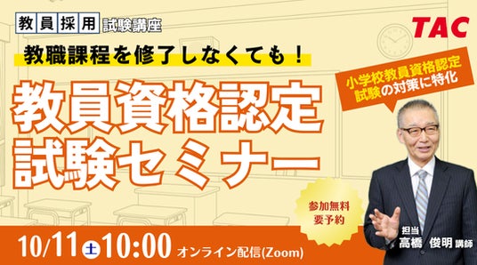 【TAC教員資格認定試験】オンラインセミナー「教職課程を修了しなくても教員免許を取得できる!」を10/11(土)に開催