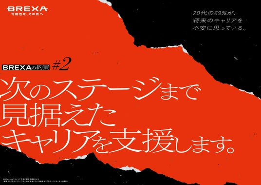 広告ビジュアルは、通勤や通学で駅やバス停を利用する人々の目に留まりやすいよう、コーポレートカラーであるBREXAオレンジとブラックを基調としたシンプルかつ力強いデザインとなっています。各ビジュアルには、日本の「はたらく」の課題と、それに対するBREXAからの「約束」が掲げられています。