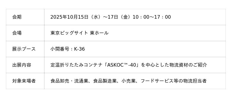 当社は、食品物流の温度管理と効率化を同時に実現する「定温折りたたみコンテナ ASKOC(TM)-40」をメインに出展し、持続可能な食品サプライチェーンの構築に貢献します。
