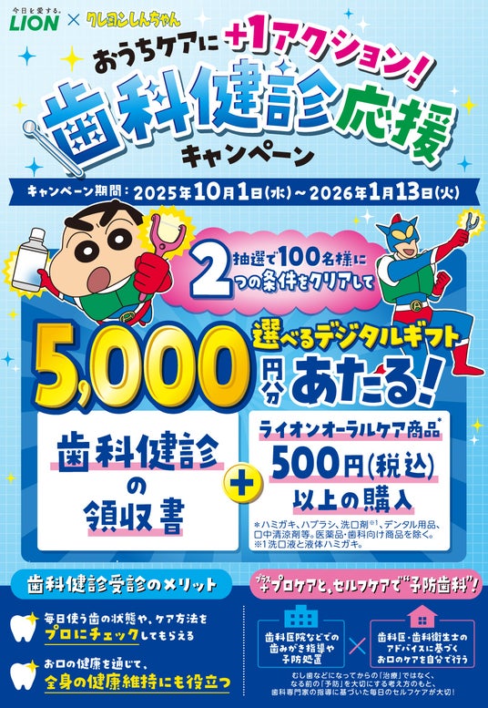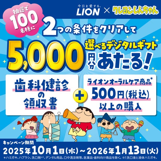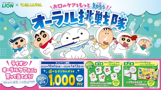 ライオン株式会社(本社:東京都台東区)は、ライオンのオーラルヘルスケア商品と「クレヨンしんちゃん」がコラボレーションした「お口のケアをもっと知ろう!オーラル挑戦隊/ハブラシまとめ買い」キャンペーンを、2025年10月1日(水)から開始します。
