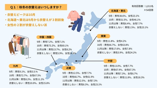 秋冬の衣替え時期は全国的に10月が中心ですが、北海道や東北では9月に衣替えをする人も多く、また北海道では靴なども9月から準備するという回答が多く、寒冷地ならではの冬の準備に対する意識の高さがうかがえます。また、性別でみると全国的に男性の方が比較的早く衣替えをする傾向で、女性の場合は「衣替えをしない派」が2割程と多い傾向です。