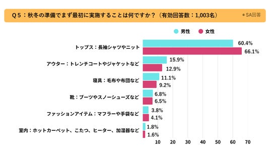 秋冬への準備として、まず最初に行うことでは「長袖やニットなどのトップス」を出すが全体の6割程で最も多く、女性の方がやや多い結果に。次いで「アウター」、「寝具」と続きます。エリア別でみると北海道では「アウター(27.5%)」と「靴(15.1%)」が高い傾向で、九州では「トップス(70.7%)」と地域性があらわれる結果になりました。