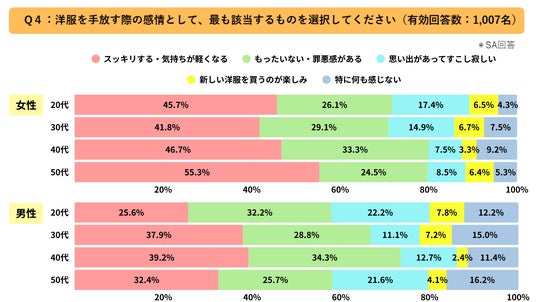 洋服を手放す際の感情では、女性の方が「スッキリする・気持ちが軽くなる」と回答した人が多く、特に50代女性では半数以上がそのように回答。男性は「特に何も感じない」と回答した人が全年代で1割強と女性よりも高い傾向。男女ともに「思い出があってすこし寂しい」と回答した人の3割は、洋服の手放し方として「フリマアプリで売る(12.4%)」 よりも「買取サービスで売る(28.4%)」を選択する人が多い傾向。