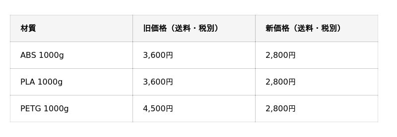 今回の価格改定により、日常使いのフィラメントからプロフェッショナル用途の素材まで、よりお求めやすくご利用いただけます。今後も、ユーザーの皆様に安心してお使いいただける高品質な製品とサービスの提供に努めてまいります。